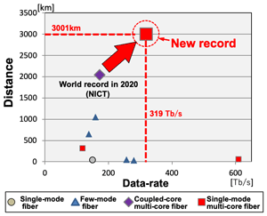 Researchers from the National Institute of Information and Communications Technology (NICT, President: TOKUDA Hideyuki, Ph.D.), Network Research Institute, succeeded the first S, C and L-bands transmission over long-haul distances in a 4-core optical fiber with standard outer diameter (0.125 mm). The researchers, lead by Benjamin J. Puttnam, constructed a transmission system that makes full use of wavelength division multiplexing technology by combining different amplifier technologies, to achieve a transmission demonstration with date-rate of 319 terabits per second, over a distance of 3,001 km. Using a common comparison metric of optical fiber transmission the data-rate and distance produce of 957 petabits per second x km, is a world record for optical fibers with standard outer diameter.