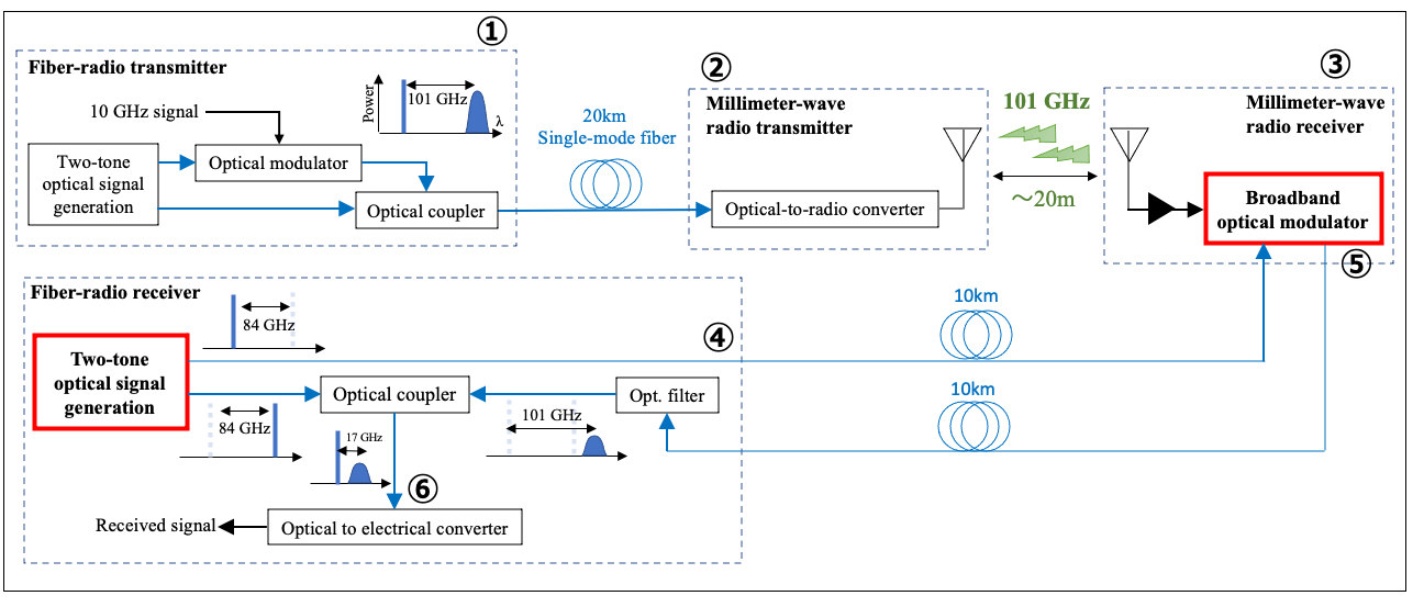 The millimeter-wave signal was received by another millimeter-wave antenna, amplified, and converted to an optical signal using the developed high-speed optical modulator.