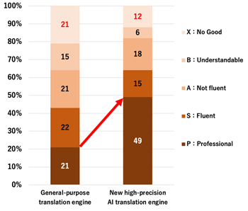 When we compared the quality of the translation of the same text between the new AI engine and a general purpose one, we found that the ratio of the highest quality translations reaching the level of professional translators specialized for the financial sector has risen from 21% to 49%; the ratio of the NG (No Good) level was also reduced by half from 21% to 12%, thus achieving overwhelmingly higher precision (See Figure 1).