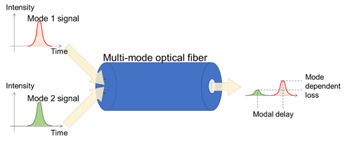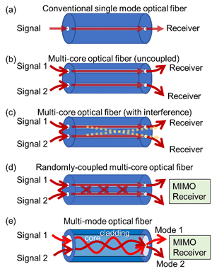Alternatively, transmission methods using multi-mode optical fibers or coupled multi-core optical fibers are being researched and developed as next-generation high-capacity transmission technologies that break through the limitation of the number of cores of uncoupled multi-core optical fibers, based on the premise that interference between cores or modes can be eliminated by MIMO digital signal processing at the receiver. To date, NICT have achieved a transmission capacity and distance of 0.273 petabits per second and 1,001 km using a 15-mode optical fiber with a standard cladding diameter. This result was mainly limited by the properties of multimode optical fibers, where large differences in propagation characteristics for each mode break their orthogonality, preventing the full digital recovery of the signal using MIMO. Coupled-core multicore optical fiber transmission is more suitable for long-haul transmission because the cores in these fibers all have the same light propagation characteristics, but the transmission over an earlier generation of 19-core coupled-core fiber was limited to 1.7 petabits per second over a relatively short distance of 63.5 km. Reducing the loss of the 19-core fibers and realizing optical amplification repeater functions for long distance transmission has been key challenges.