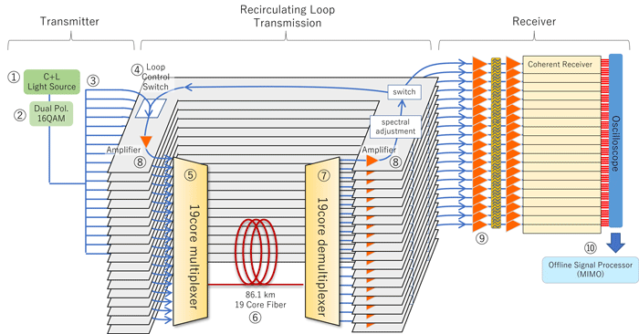 The transmission system consisted of a transmitter and receiver, and a set of 19 recirculating transmission loops (see Figure 5 for details). Each loop ran through one core of an 86.1 km, 19-core, optical fiber with signal combiners and splitters, a set of optical amplifiers, and a control switch. The amplifiers were used to boost the signal before transmission in the 19-core fiber and to compensate its loss after transmission. For this demonstration, the signals travelled 21 times through the recirculating loop, for a total transmission distance of 1,808 km. Each amplifier was actually composed of two smaller devices to separately amplify the C and L bands. This allowed a total of 180 wavelengths in the C and L bands, each using 16QAM signals.
