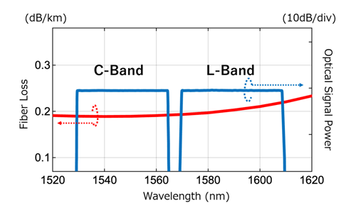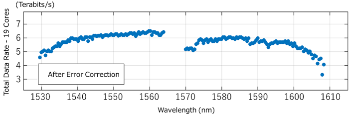 Sumitomo Electric was responsible for the design and manufacture of a coupled 19-core optical fiber with a standard cladding diameter (see Figure 1), and by optimizing the structure and arrangement of the cores, achieving a reduction in optical fiber losses across multiple wavelength bands (C-band and L-band) (see Appendix Figure 6 for details). NICT and the international team were responsible for the development and demonstration of a transmission system with the ability to amplify signals of 19 cores simultaneously, achieving a transmission capacity and distance of 1.02 petabits per second and 1,808 km.