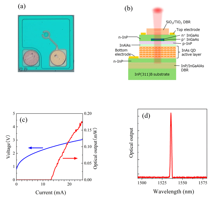 VCSELs employing quantum dots as optical gain materials, exhibit excellent temperature stability. In addition, VCSELs exhibit scalable structures that enable mass production. These characteristics are expected to enable higher performance, reduced cost, and higher output via the integration of optical communication wavelength-band lasers.