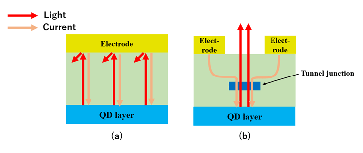 Sony contributed to the second core technology: a device design and fabrication process that enables highly efficient current injection employing a structure called a tunnel junction. VCSELs emit light perpendicular to the wafer surface; therefore, even if quantum dots emit light, conventional electrode placement obstructs light extraction. Sony addressed this by implementing a tunnel junction structure that permits efficient current flow while facilitating light extraction employing a precise device process.