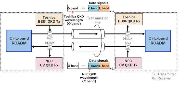 For the QKD schemes, Toshiba adopted Bennett-Brassard 84 (BB84), a protocol whose security is theoretically proven based on quantum mechanics, while NEC adopted the continuous-variable (CV), a protocol that enables easier in-band multiplexing with data signals, as well as compact and low-cost implementation. The two types of quantum signals in QKD, along with their respective control signals, were transmitted over two-core optical fibers, each of which is assigned to different propagation direction. To simulate the actual environment used in the optical backbone networks of telecommunication carriers, dummy optical signals for data communication equivalent to a total capacity of 47.2 Tbps were multiplexed with the QKD signals on the same fiber, spanning the full C and L wavelength bands with an optical output power with +17 dBm. Wavelength assignment was carefully controlled to prevent interference between the signals, and the transmission took place over a distance of 25 kilometers. Under these conditions, the simultaneous generation of encryption keys by the two QKD protocols was successfully demonstrated over an 8-hour continuous period. It was also confirmed that main signals for high-speed data transmission, with 400 Gbps and 800 Gbps per wavelength, assigned within the C and L band ranges, could be transmitted error-free while coexisting with single-photon-level QKD signals.