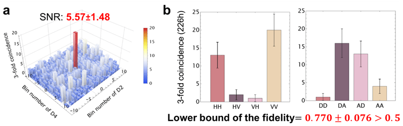 As a result, the SFG photons were detected with a high SNR (see Figure 3a), achieving nearly an order of magnitude improvement compared with the previous study [2]. Furthermore, the researchers confirmed the presence of strong entanglement in the final state (see Figure 3b), estimating a lower bound of the fidelity to the maximally entangled state as 0.770 ± 0.076.