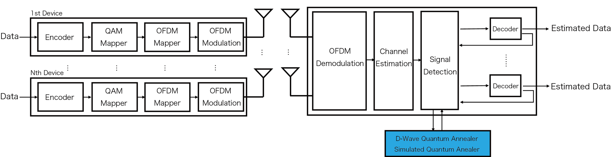 Previously, we developed a hybrid signal processing method that combines a quantum annealing machine with classical computing (hereafter referred to as the “previous method”). In this framework, the quantum annealing machine efficiently explores candidate signal combinations, while a classical computer performs post-processing to estimate the probability distributions required for signal detection, thereby achieving both high detection accuracy and fast processing. However, the effectiveness of the previous method had only been demonstrated for limited communication scenarios. Its applicability to multi-antenna and multi-carrier transmission, which is essential component of both 5G and future 6G systems, remained unclear. To address this limitation, NICT developed a new hybrid signal processing method that integrates the quantum annealing machine with a classical computer and is applicable to multi-antenna and multi-carrier transmission (see Figure 1). The proposed method also incorporates essential components of modern mobile communication systems, such as channel estimation using reference signals, making it suitable for practical 6G deployment.