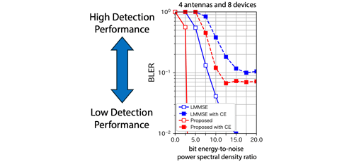We evaluated block-error-rate performance of the proposed method through numerical simulations under the following conditions: four receive antennas at the base station, QPSK modulation (𝑀=4), and eight connected devices (𝐾=8). This setting corresponds to a combinatorial optimization problem involving approximately 48≈60,000 possible signal combinations. In these simulations, simulated quantum annealing (SQA) was used as the annealing method. The results confirmed that the proposed method achieves higher detection performance than the widely used linear minimum mean square error (LMMSE) approach (see Figure 2).
