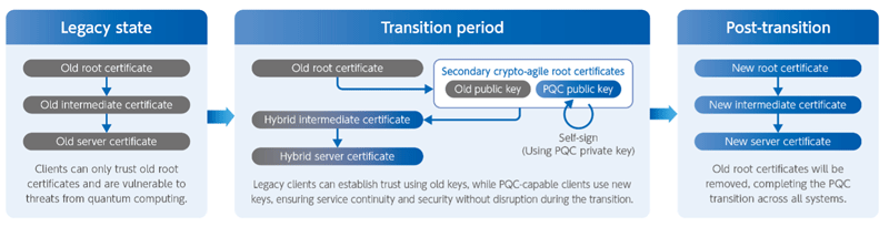 Secondary crypto-agile root certificate A hybrid root certificate that supports signing with both current cryptography and PQC. It facilitates a seamless transition without disrupting existing systems by establishing a PQC-based certificate chain while also maintaining full backward compatibility with current cryptography verification processes. Back to contents