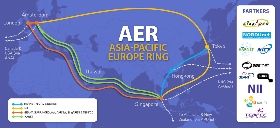 The initial AER MoU, signed in July 2019, set up a co-operative arrangement for leading-edge Research and Education Networks (RENs) with 100G connectivity between Europe and Asia to provide back up for each other in the event of any link failure, thereby creating an extremely robust and resilient 100G network ring.