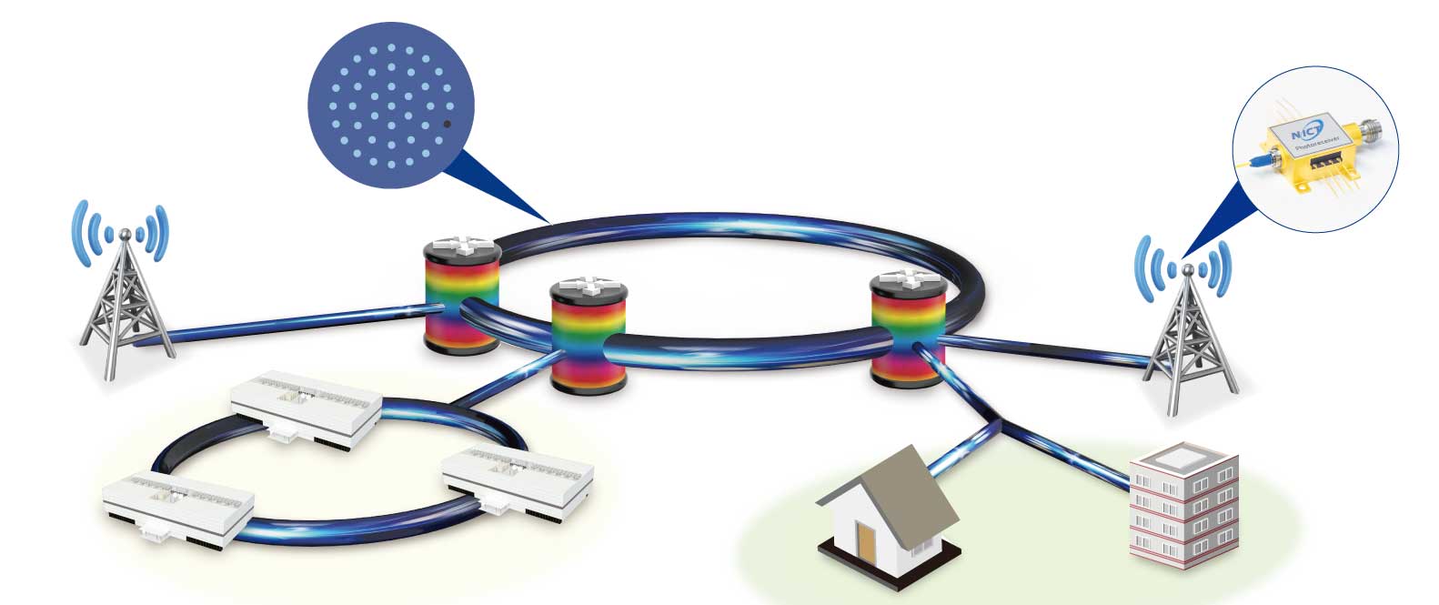 私たちネットワーク研究所は、5カ所(東京・小金井、神奈川・横須賀、宮城・仙台、茨城・鹿島、兵庫・神戸)を拠点に活動しています。前中長期計画期間における「統合ICT基盤分野」の研究開発で培った技術を礎に、 Beyond 5G 時代における Society 5.0 の高度化による社会システムの変革を実現するため、通信トラヒックの急増や通信品質の確保、サービスの多様化等に対応しうる「革新的ネットワーク」分野の研究活動を実施します。すなわち、Beyond 5Gで望まれる機能である広帯域通信や超低遅延、高信頼を叶えるため、光・無線・ネットワーキング等の基礎・システム技術を高める研究活動をしています。また、光や超高周波等の周波数帯を融合して活用できる革新的な情報通信デバイス要素技術の研究開発を支援・推進するオープンイノベーション拠点を備えます。