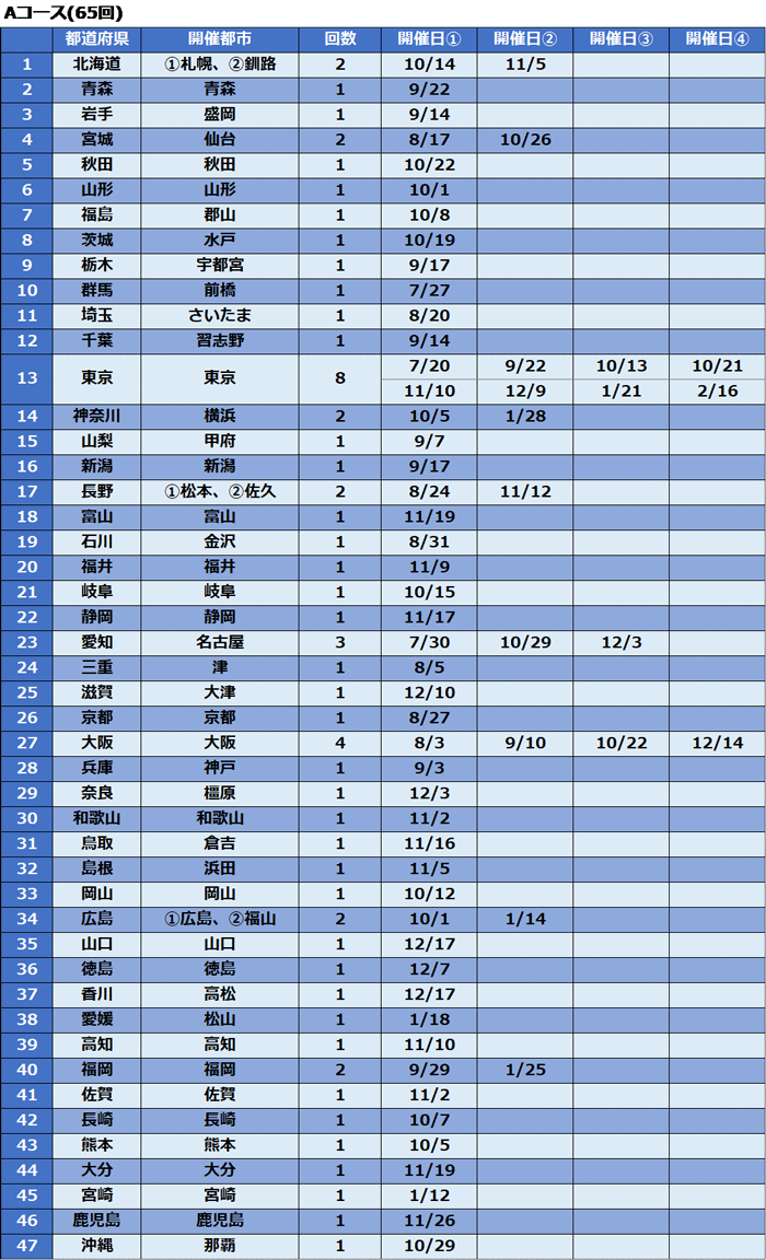 | Aコース | 初級 | 7月〜2月 | 全ての組織 | 65回 | 全国47都道府県 |