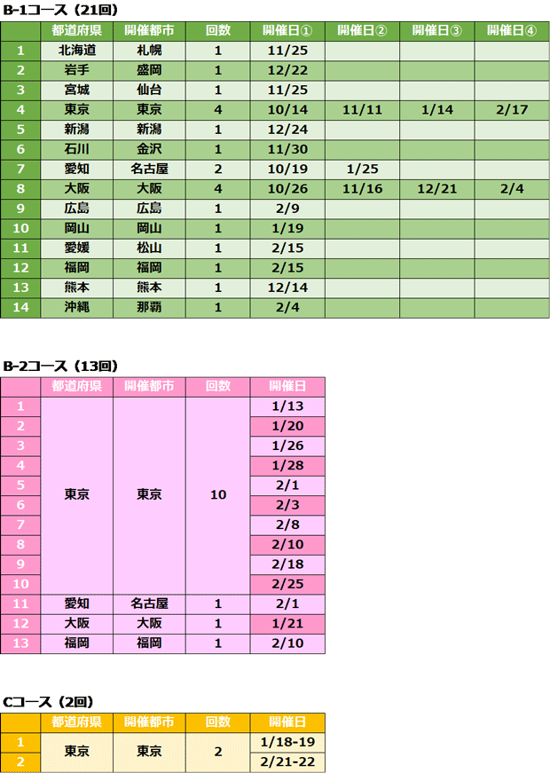| Cコース | 準上級 | 1月〜2月 | 全ての組織 | 2回 | 東京 |