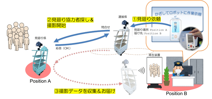 NICTソーシャルICTシステム研究室は、オフィス・ホテル・病院等のビル内や駅・商業施設等の構内で活躍が期待される様々な業種のサービスロボットの急速な普及展開に着目し、これらサービスロボットが人からの依頼を受け付けて、4Kカメラでの撮影による見廻りを行う自律移動サービスロボット協働型見廻りシステムを、ソニーセミコンダクタソリューションズ株式会社と共同で開発しました。同一オフィスビル内における実証実験により、見廻り後の撮影データを短時間かつ非接触で見廻り依頼者の再生装置に転送し、自動再生できることを確認しました。