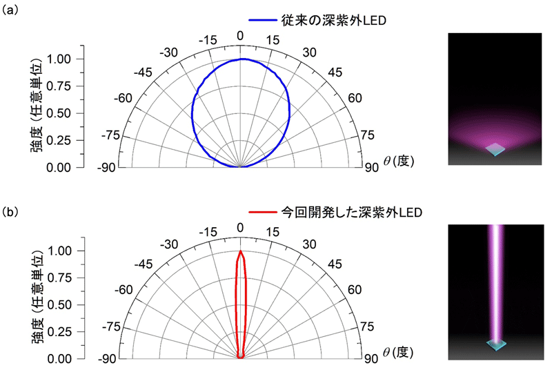 深紫外LEDを用いた殺菌や通信応用の今後の普及を見据えると、高コストのレンズや光学部品を使用せずに、深紫外LEDチップ単体で配光角を制御でき、照射が必要な箇所のみに安全性高く、高強度の深紫外光を効率的に照射できる技術の創出が求められていました。