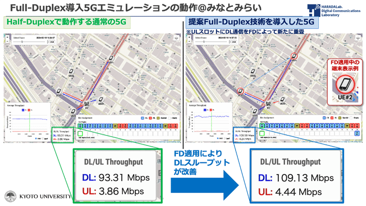 なお5G-NRの仮想無線機の開発にはOAI (OpenAirInterface) software Allianceが供給するオープンソースを利用し、京都大学がワイヤレスエミュレータにおけるHD、提案FD動作に対応するさまざまな追加機能をオリジナルで開発し、搭載しています。これらの成果を用いて神奈川県横浜市(みなとみらい地区)を想定した環境に基地局1台、端末5台の仮想無線機を配置し(図5参照)、HDに基づく現行の5Gシステムと、提案FDに基づくB5Gシステムを動作させました。5台の端末のうち、1台の端末は大通り上を移動し、端末の位置に併せて、FDの適用状況を含む端末スケジューリングがダイナミックに変化しさらにFDによるスループットの拡大効果の評価実証に成功しました(図6参照)。