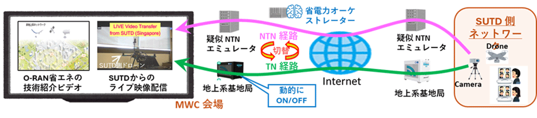 - 地上通信ネットワーク(TN)とNTNの融合による省エネルギー化と通信品質最適化を目的とした、シンガポール工科デザイン大学(SUTD)との協働による、スペインとシンガポール間の大陸をまたいだ基地局制御を実演します。これによって、TNとNTN経路の動的切替えによるエネルギー効率の向上を実証します。