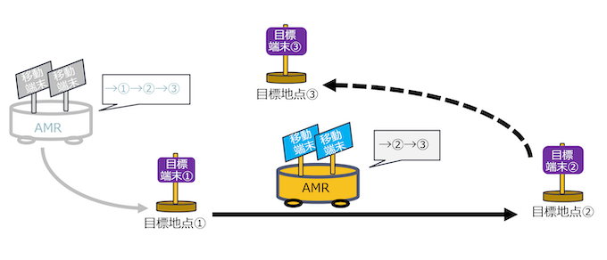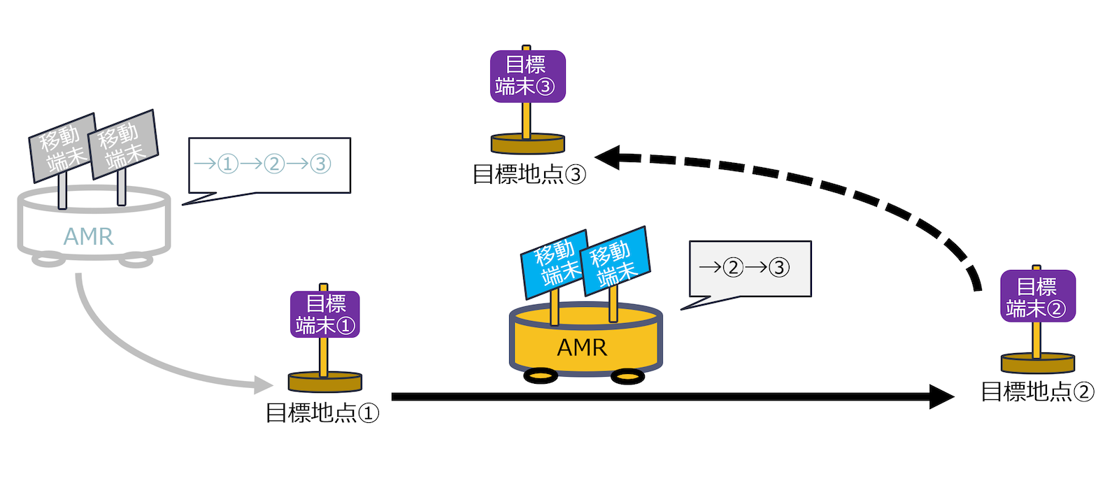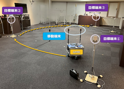 事前の地図作成等が不要で、IR-UWB端末を目標地点とAMR上に置くだけで、連続自動走行が可能