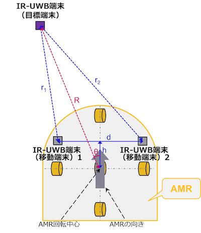 高精度な距離計測が可能なIR-UWBを用いて開発した自律走行システムは、事前に対象エリアの地図作成と座標標定作業をすることなしに、複数の目標地点に置かれたポータブルなIR-UWB端末(目標端末)と、AMRに載せたIR-UWB端末(移動端末)との間でリアルタイムに距離計測を行い、連続自動走行を行います。