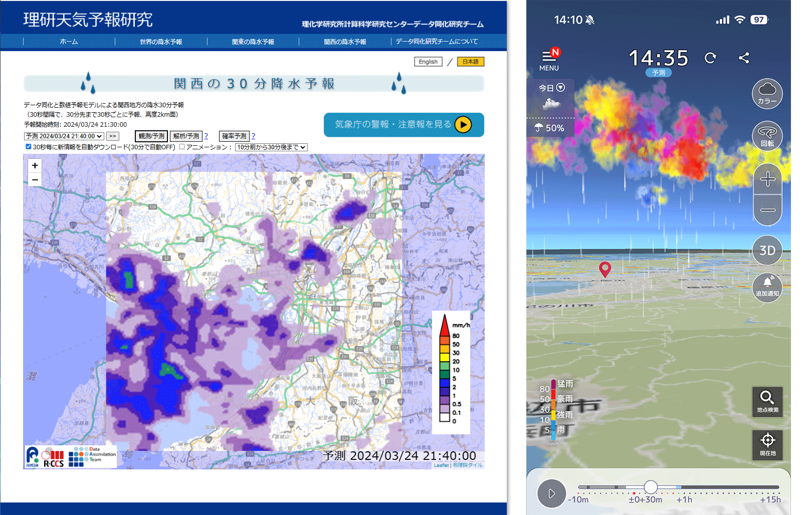 実証実験で得る予報データは、気象業務法に基づく予報業務許可の下、理研の天気予報研究のウェブページ(https://weather.riken.jp/)およびエムティーアイのスマートフォンアプリ「3D雨雲ウォッチ」で8月5日から8月31日まで公開します。