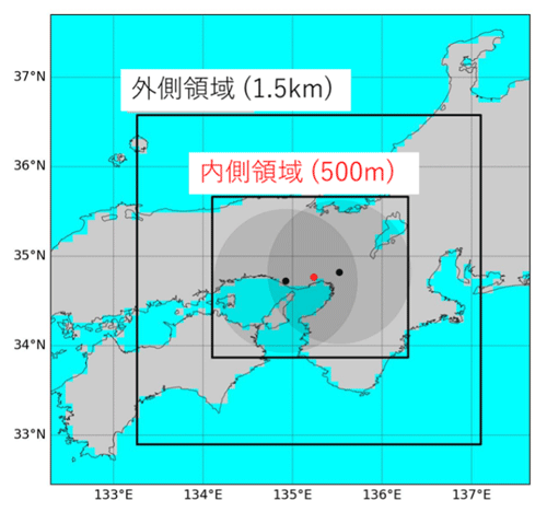 2021年の東京オリンピック・パラリンピック開催期間中の実験では、さいたま市の1台のMP-PAWRのみを用いて実験を行いました。今回は神戸市と吹田市の2台のMP-PAWRを用いるため、計算領域を広く関西地域に設定しました(図1)。2021年の実験と同じく、計算領域は広範囲の予測計算を行う1.5km格子の外側領域と、MP-PAWRのデータを取り込んで詳細に予測計算する500m格子の内側領域から構成されます。