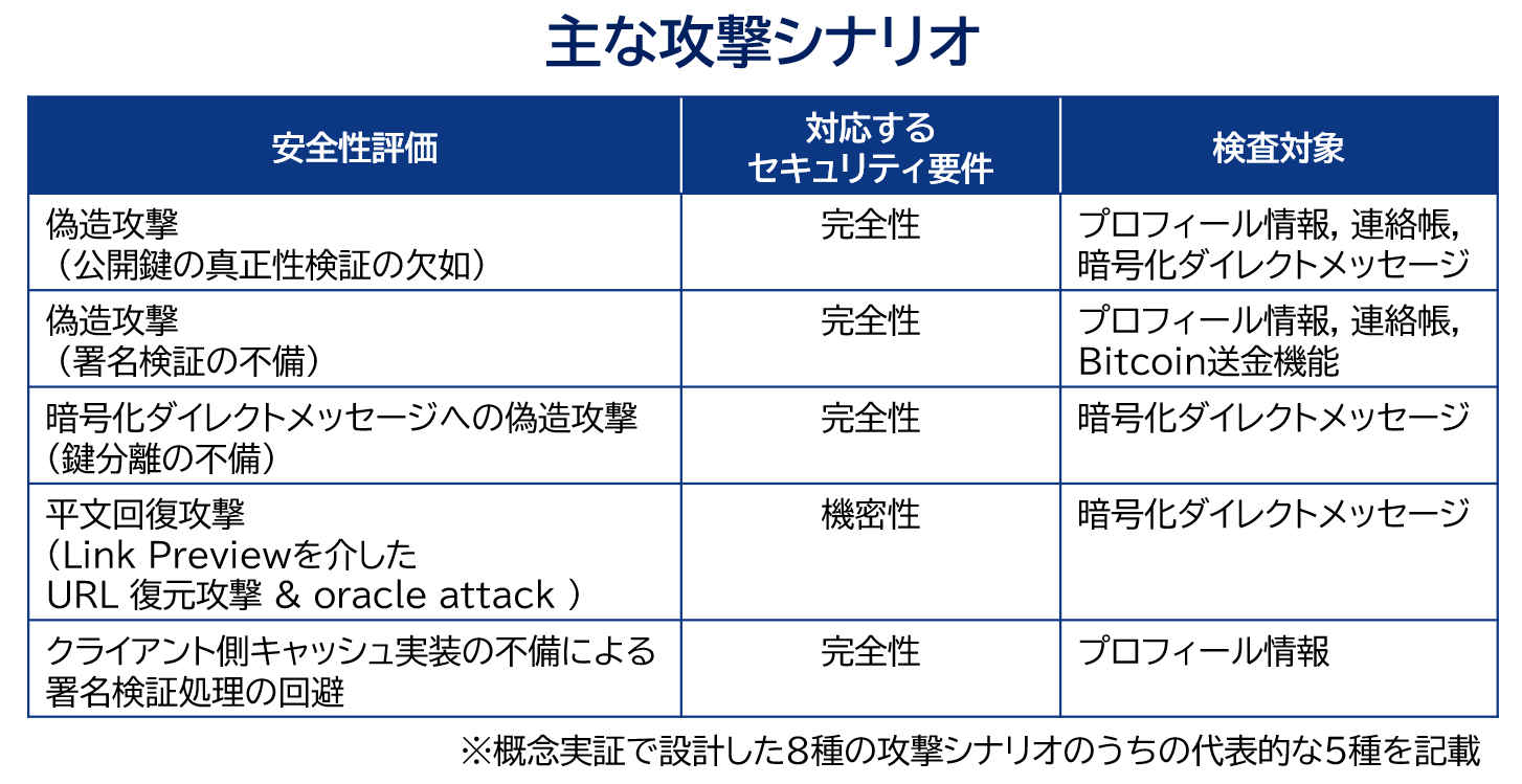 これらの安全性評価の結果は、2023年6月及び2024年1月に各アプリ開発者へ報告し、連携を開始しました。その際、攻撃シナリオを回避するための対策手法を提案するとともに、プロトコル設計全般に対する改善点を示しました。現在、これらの対策は主要クライアントアプリにおいて段階的にパッチ適用や機能改修が実施されています。