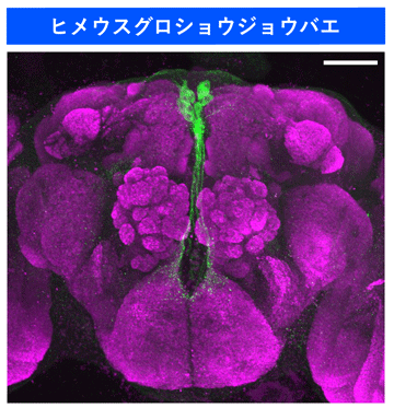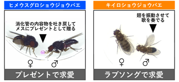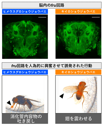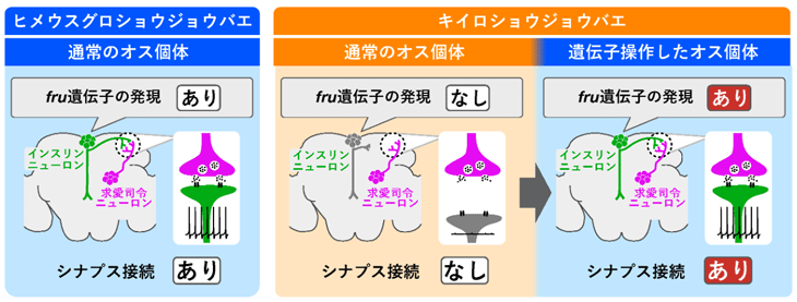 その“配線構造”を別種のハエの脳内に遺伝子操作で再現することで、プレゼントを贈る行動の“種間移植”に成功。