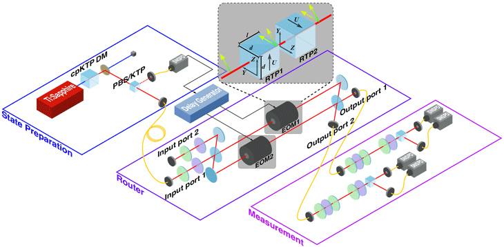 東北大学大学院理学研究科の金田文寛教授とPengfei Wang大学院生、国立研究開発法人情報通信研究機構(NICT)未来ICT研究所神戸フロンティア研究センター超伝導ICT研究室の藪野正裕主任研究員らの研究グループは、量子情報を担う量子ビットとして直接利用できる単一光子の偏光状態や量子もつれ状態を、低損失かつ高度に維持しながら伝送経路を切り替えられるルーターの開発に成功しました。このルーターは、偏光状態によらず光子の位相を制御する電気光学素子や、既存の光学干渉計を変形させたユニークな構造をもつ光学干渉計の開発によって実現されました。