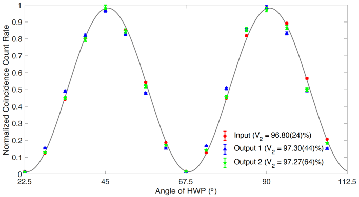 実験では、光通信で使用する波長域にある単一光子源や量子もつれ光子源を用いてルーターを評価しました。ルーターの通過による単一光子の損失は1.3%(0.06dB)、光子の伝送経路を切り替える精度は99.3%、光子の偏光が維持されている確率は99%以上であり、これまで報告されてきた光子ルーターデバイスを上回る性能を示しました。さらに、このルーターを用いた量子もつれ光子のルーティングを実証しました。量子もつれ光子は、量子ネットワーク構築の資源となりますが、複数光子の強い相関状態にあるため、高精度なルーティングは単一光子よりも挑戦的になります。本研究では、世界で初めて偏光が直交する2光子の量子もつれ状態(N00N状態)の伝送経路をルーティングし、N00N状態の特徴である、干渉縞の周期が古典的な光学干渉の1/2になる現象を高い明瞭度(97%)で観測しました(図3)。