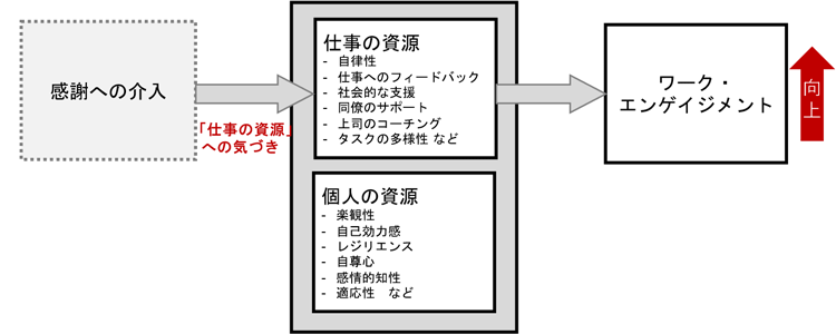 以上の結果から、感謝に注意を向けて記録することで、ワーク・エンゲイジメントが向上することが明らかなりました。また、この効果の基本的なメカニズムとして、仕事の資源への認識を高め、働く意欲が改善される可能性が示唆されました。