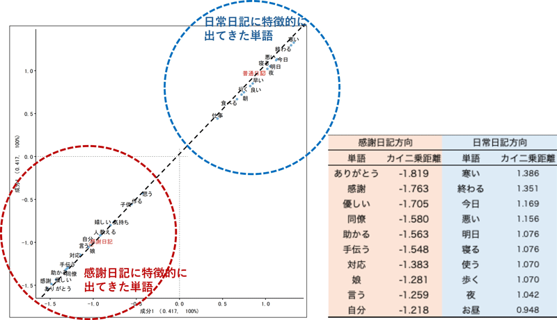 図4. 対応分析結果 (それぞれの日記に特徴的な出現単語)
