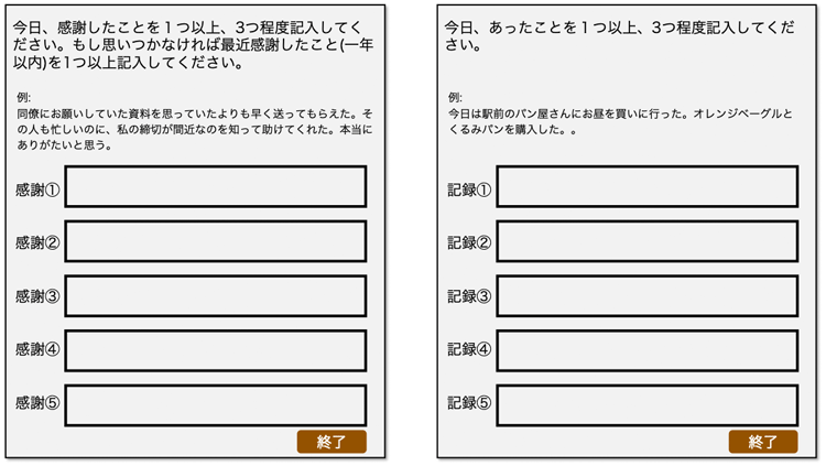 調査には、日本国内の企業に勤務する100名(平均年齢41.0歳、男女各50名)が参加し、実験参加者は無作為に感謝日記群(実験群)または日常日記群に割り当てられました。スマートフォン用のアプリを用いて、感謝日記群は日々感謝したことを記述し、日常日記群は日々の出来事を記録しました(図2)。