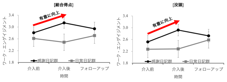 図3. 感謝によるワーク・エンゲイジメントの向上 (左: 総合得点, 右: 没頭 (下位尺度))