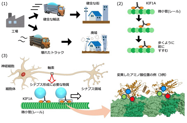 モータータンパク質キネシン・KIF1Aは、神経細胞内でシナプス形成に必要な物質を運ぶ“分子モーター”として働き、神経活動を支える重要な役割を担っています。このKIF1Aに変異が生じると、物質を運ぶ速度や力が著しく低下し、輸送機能が損なわれます。その結果、神経細胞の働きが障害され、「KAND(KIF1A Associated Neurological Disorder)」と呼ばれる神経疾患を発症します(図1)。KANDは歩行障害や視覚・聴覚の低下、発達の遅れ、けいれんなど多様な症状を引き起こし、近年は日本でも認知され患者が確認されるようになってきています。KANDを引き起こすKIF1Aの変異体は100種以上知られています。KIF1A変異体の力や速さといった運動機能(力学的性質)は、KANDの病状の重症度と相関することが知られており、力学的性質を調べることは疾患理解において重要です。