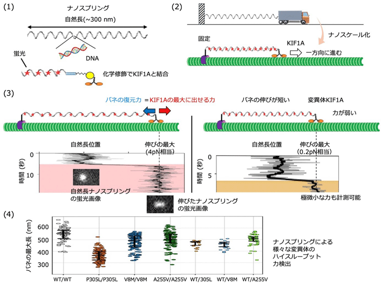 DNAを材料にした世界最小コイル状バネ「ナノスプリング」の伸びを可視化し、神経疾患を引き起こすモータータンパク質キネシン・KIF1Aの変異体の力学異常を定量化。