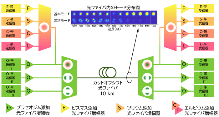 従来の長距離伝送用の光ファイバは、一般に単一モード伝送を利用している。図3に示すように、伝送される光の波長と同程度のコア径を有する光ファイバでは、光信号の伝送経路がただ一つとなり、基本モードと呼ばれる一つのモードのみ伝送される(単一モード伝送)。しかし、光の波長がコア径よりも十分に短い場合、新たな光信号の伝送経路となる高次モードが発生し、基本モードと合わせて複数のモードの伝送が可能となる(マルチモード伝送)。ITU-T G.654光ファイバにおいて、単一モードとマルチモード伝送の境界はC帯上の1,530 nmである。このため、1,530 nm未満の波長ではマルチモード伝送が可能であり、1,530 nm以上では単一モード伝送となるが、実際にマルチモード伝送を活用するには閾値よりも大幅に短い波長が必要である。このため、本研究では閾値より200 nm以上短いO帯上(約1,310 nm付近)の波長を用いて、3モード伝送を実現している。