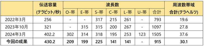 現在の長距離向けの光ファイバ伝送システムでは、主にC帯が利用されていて、波長数は80程度である。また、L帯も一部で商用に利用されている。それに対し、T帯、O帯、E帯、S帯、U帯などは開拓中の新しい波長帯であり、商用化が進んでいない。