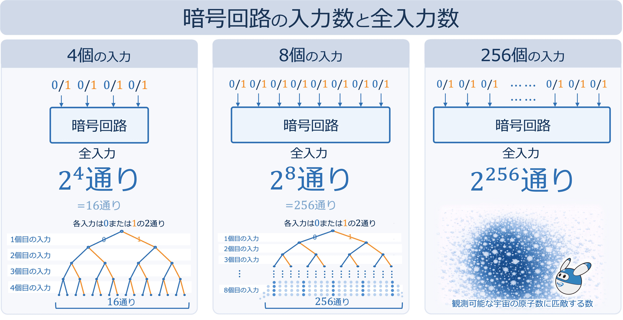 全入力2の256乗通り 暗号回路には0又は1の値をとる入力を複数個与える。例えば入力が4個ある場合、それぞれの入力は0又は1の2通りの値をとるため、入力できる全ての値(全入力)の総数は2の4乗通りとなる。同様に、入力が8個ある場合、全入力は2の8乗通りとなる。一般に、入力がn個ある場合、全入力は2のn乗通りとなる。セキュリティ強度を高くするほど、全入力の数は増える。本研究で設計した暗号回路は高いセキュリティ強度を実現するため、入力は256個であり、全入力が2の256乗通りとなる。2の256乗通り(約10の77乗通り)は、観測可能な宇宙に存在するとされる原子の数に匹敵する非常に大きな数である。 元の記事へ