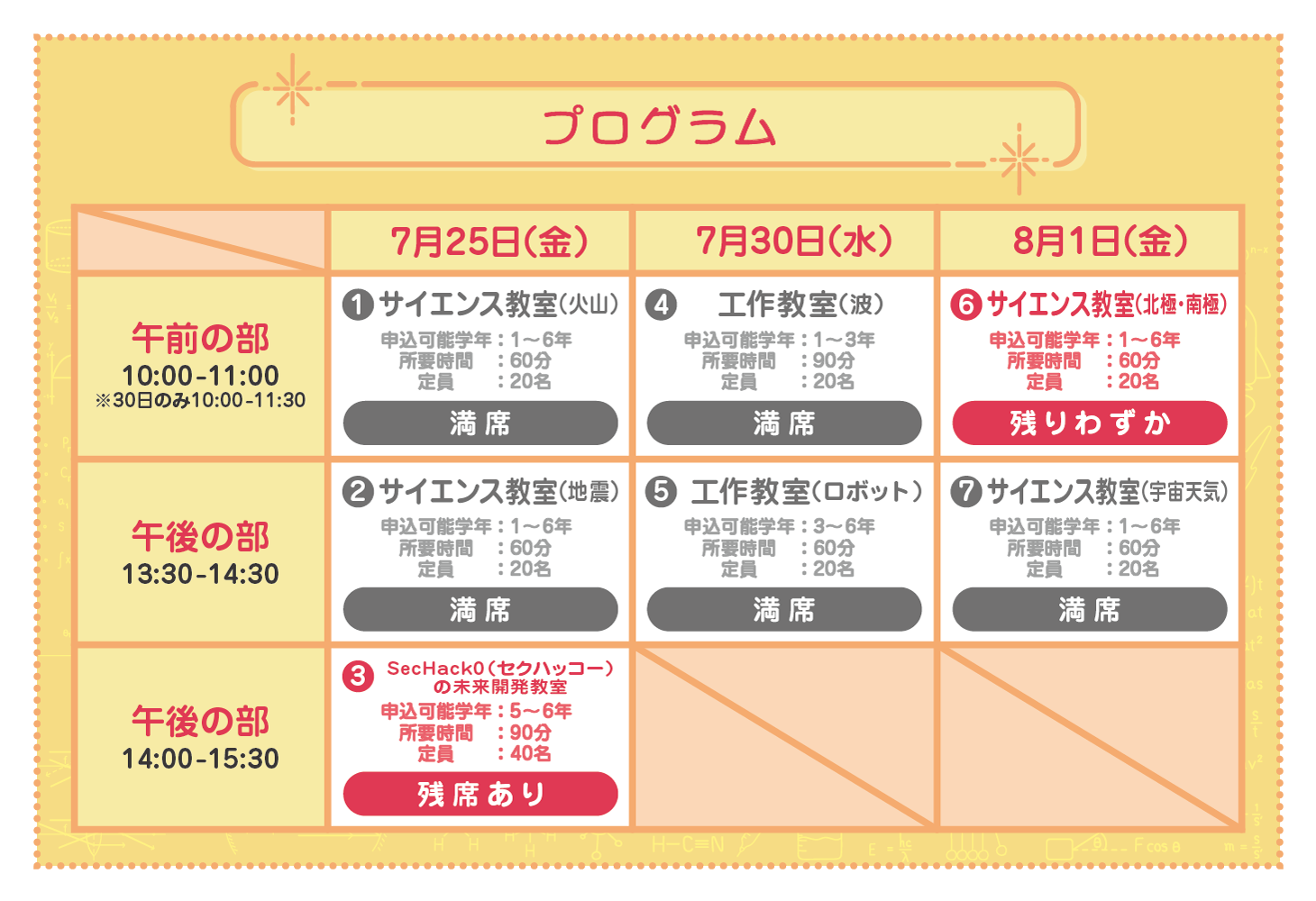 | 各教室テーマ | 火山、地震、サイバーセキュリティ、波、ロボット、北極・南極、宇宙天気 |